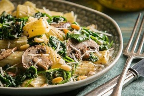 - نغرف المكرونة المسلوقة فى طبق التقديم ونوزع فوقها صوص السبانخ ثم تزين بالصنوبرتقدم ساخنة بالهنا والشفا.