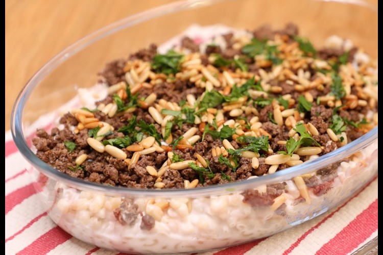 5. وزعي اللحم المفروم المقلي فوق المكرونة واللبن.