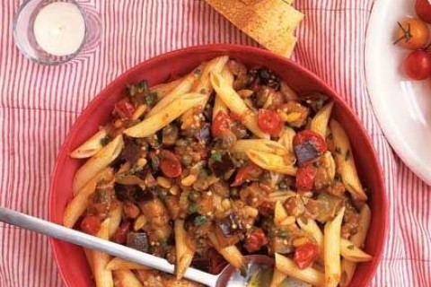 - تسلق المكرونة، وفي مقلاة على النار نقلي الباذنجان والفلفل الرومي.