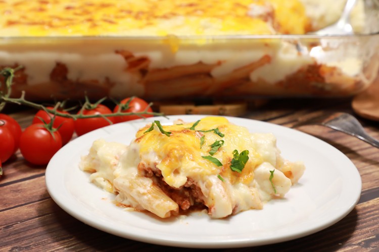 7. أضيفي صلصة البشاميل فوق المكرونة.