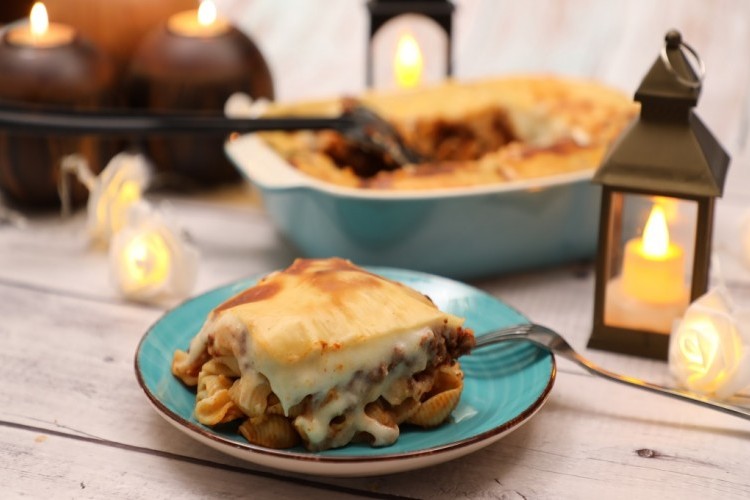 - أضيفي خليط اللحم ثم أضيفي البشاميل على الوجه.