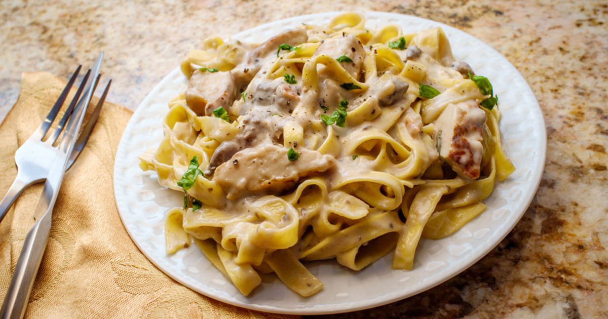 3- أضيفي المعكرونة إلى الصلصة. زيدي مزيج البصل والدجاج وقلّبي المكونات حتى تتداخل.