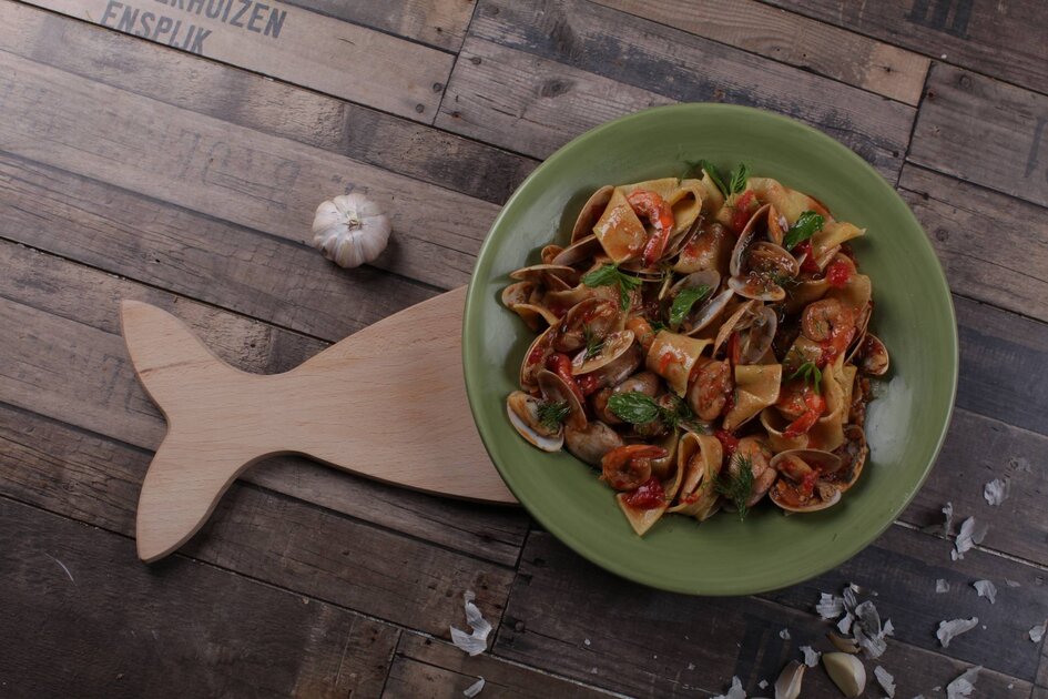 يتم عجن مكونات الباستا مع بعض فى العجان ثم تشكل ثم يتم سلق المكرونة 4 دقائق