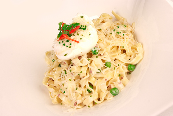 2. اخلطي الباستا مع البصل المسلوق والبيف المدخن ثم الكريمة والجبنة الماسكربوني والبازلاء، وقلبيها جيدًا مع إضافة الفلفل والبرميزان، وضعي على الخليط من الأعلى البيضة المسلوقة، وقلبيها أمام ضيوفك.