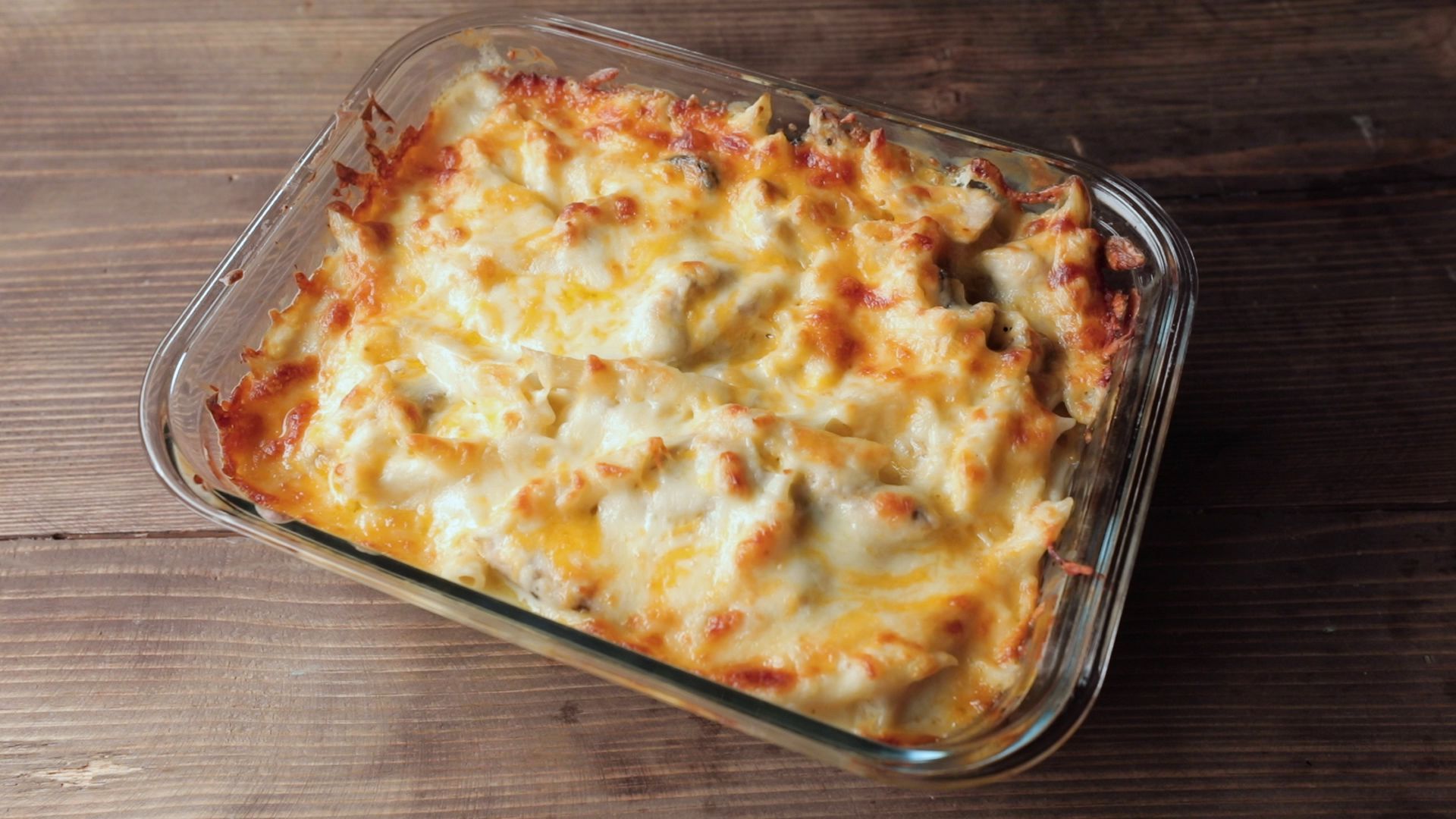 6- ضعي في صينية فرن المعكرونة الدجاج وصلصة البشاميل وقلّبي حتى تتداخل المكونات.