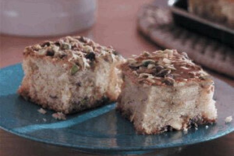 - يُسكب المزيج في القالب المجهّز ويُرش النصف الثاني من كوب الفستق على الوجه ويوضع في الفرن لمدّة تتراوح بين 20 و25 دقيقة أو إلى أن يتم إدخال سيخ في وسطه وإخراجه جافاًً.