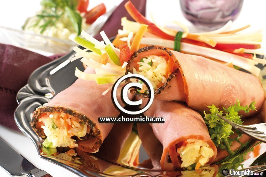 - تزين كل شريحة الديك الرومي المدخن بالحشوة وتلف حول نفسها لتشكيل أصبع.