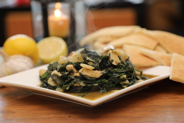 4. سخني الزيت النباتي في مقلاة وحمصي الثوم، ثم ارفعي المقلاة عن النار وأضيفي الكزبرة الخضراء والكزبرة المطحونة واخلطي ووزعي الخليط فوق الملوخية.