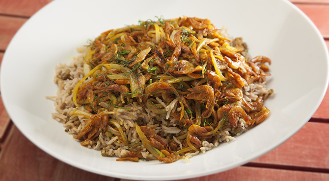 في هذه الأثناء يصفى الروبيان من الماء. في مقلاة أخرى تذبل أعواد البصل في زيت نباتي ثم يضاف الروبيان ويقلّى، ثم يضاف الشبت المفروم إلى الروبيان.
