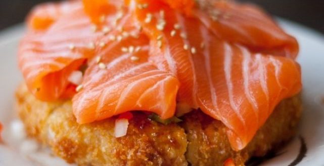 9.للتجميع، وزعي المايونيز على قرص الأرز المقلي، وزعي فوقه شرائح الأفوكادو. ثم وزعي السلمون وشرائح التونة بالتبادل بشكل حلقي.