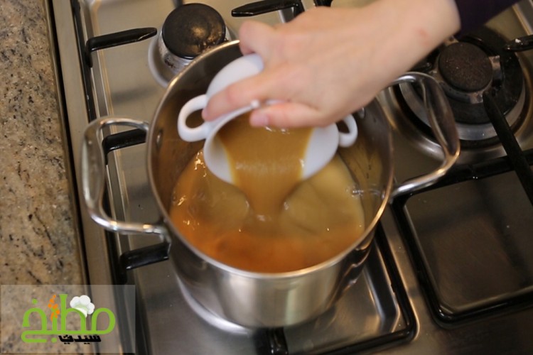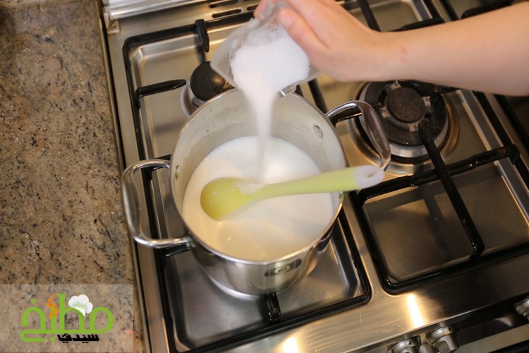 في قدر صبي الحليب السائل ثم أضيفي السكر، وماء الزهر، والورد، وحركي حتى ذوبان السكر وهو بارد