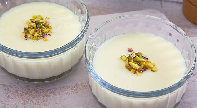 يصب في أكواب التقديم، ويزين بالفستق الحلبي المفروم ثم يوضع في البراد مدة 4 ساعات كحد ادنى. تقدم باردة.