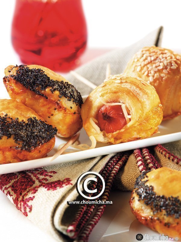- تلف كل قطعة نقانق بشريط من العجين المورق، تمدد أطراف الشريط جيدا وتدهن بأصفر البيض لالصاقها.