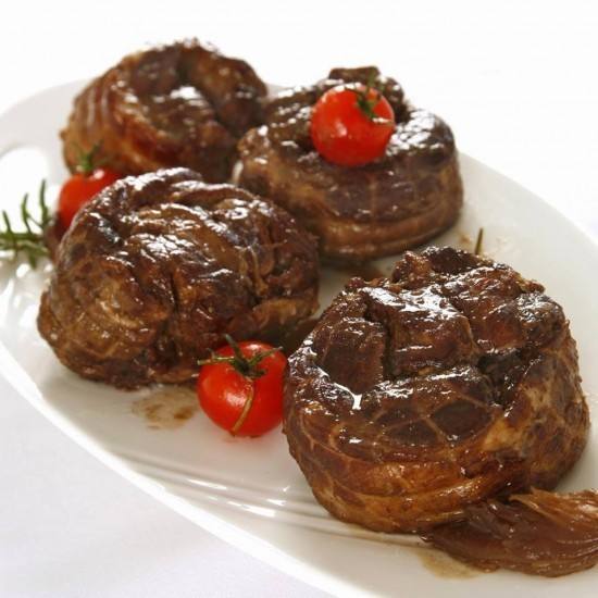 - لفى موزات الضأنى بخيط سميك قبل تقطيعها إلى شرائح عريضة بسمك 5 سم .