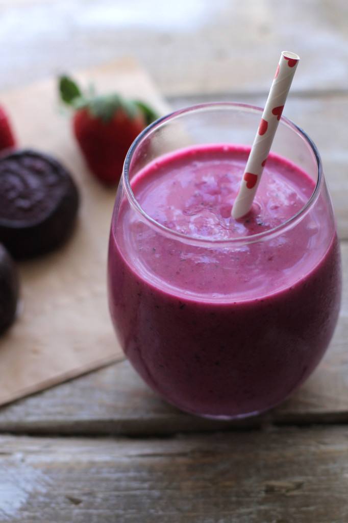 1. يوضع اللبن و البنجر و الفراولة والسكر في الخلاط وتخلط جيداً.
