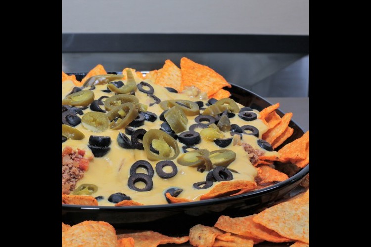 4. للتقديم: تفرد رقائق الشيبس بطبق التقديم، ثم يسكب خليط اللحمة والطماطم فوقه، ثم توزع جبنة الناتشوز، ويرش الزيتون الأسود المقطع، والهالبينو، ويقدم.