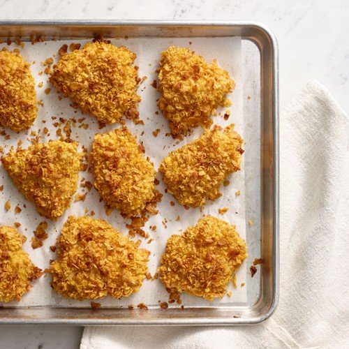 - في وعاء متوسط، اخلطي اللبن، الفلفل الحار، بودرة الثوم، ونصف ملعقة صغيرة ملح، حركي قطع الدجاج في هذا المزيج، ثم غطيهم برقائق الذرة، واضغطيهم بلطف لتساعديهم على الالتصاق جيداً.
