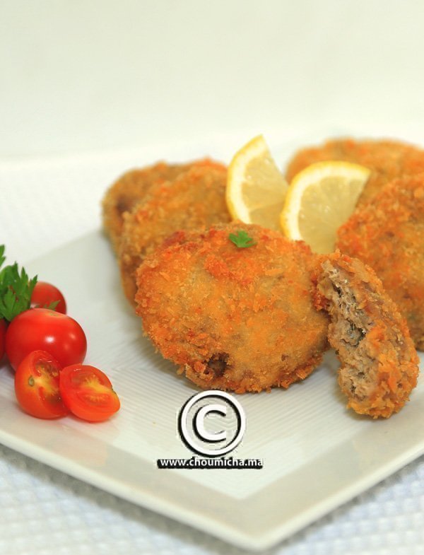 - تشكل خبيزات صعيرة من الخليط، تمرر في الدقيق ثم أصفر البيض ثم البقسماط.