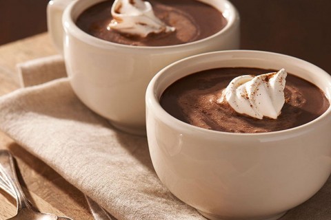 3. نرفع المزيج ويصب في كاسات التقديم ويزين بالكريمة المخفوقة والشيكولاتة المبشورة.