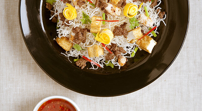 تُفكك نودلز الشعيرية، ويُستخدم نفس الزيت الساخن في قلي الشعيرية في زيت غزير على دفعات حتى تنتفخ. وتُصفى على ورق تجفيف.