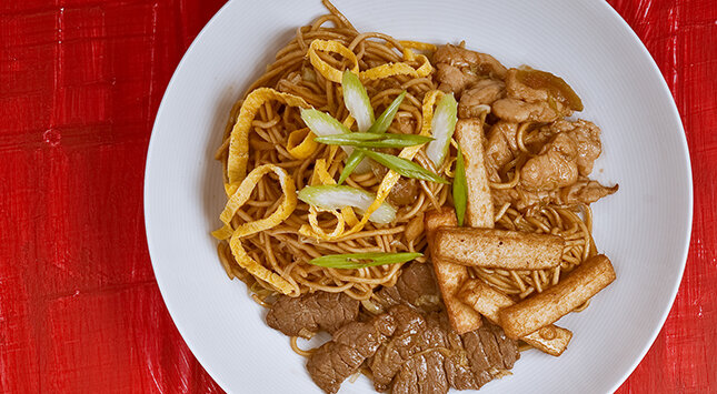 تُسخن مقلاة الووك على نار عالية الحرارة، وتُضاف 2 ملعقة كبيرة زيت وتُحرك المقلاة على شكل دوامة. يُضاف الدجاج واللحم البقري والثوم، ويُحمر الخليط لمدة ½1 دقيقة. يُضاف الملفوف والبصل الأخضر والكرفس ويُحمر لمدة 1 دقيقة. يُضاف ويُقلب المرق والصويا الحلوة وصلصة المحار وصوص الصويا. يُضاف النودلز والتوفو ويُحمر الخليط لمدة 3 دقائق أو حتى تسخن تماماً وتبدأ النودلز أن تُحمر قليلاً. يُضاف البيض ويُقلب برفق، ويوضع البصل المقلي على الوجه ويُقدم مباشرة.