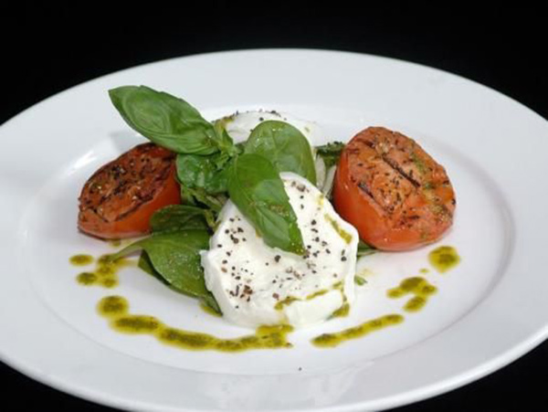 2. تشوى حبتا البندورة في الفرن، وتقدّمان إلى جانب الجبنة، ويزيّن هذا الطبق بأوراق من الريحان الطازج.