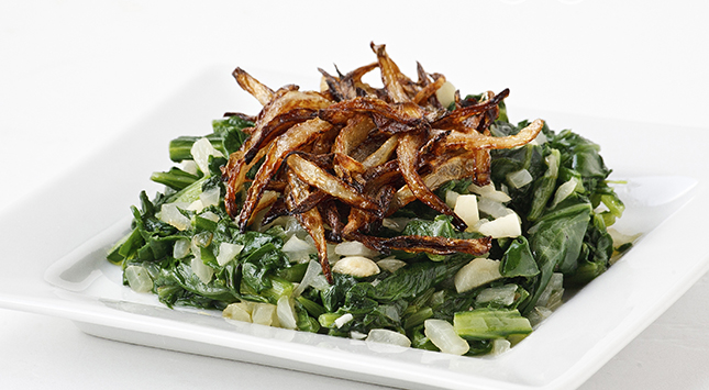 تُقدم الهندباء مزينة بالبصل المحمر الذهبي المقطع إلى أصابع رفيعة.