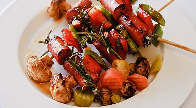 توضع أعواد إكليل الجبل بين فتحات الهوت دوج المتبل، ثم يُغرس في الأسياخ بالتناوب مع الفلفل الرومي.