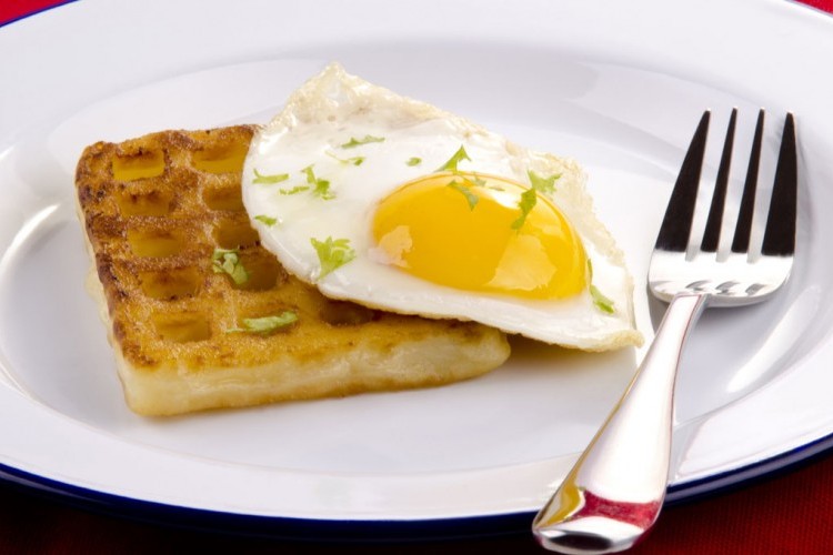 7. قدمي الوافل دافئاً مع بيض عيون مقلي ورشة من الصلصة الحارة حسب الرغبة.