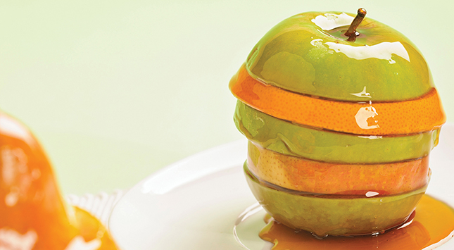 تُقطع قطعتان من الفاكهة التي بنفس الحجم تقريبًا وتُكدس القطع بالتناوب.