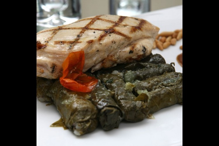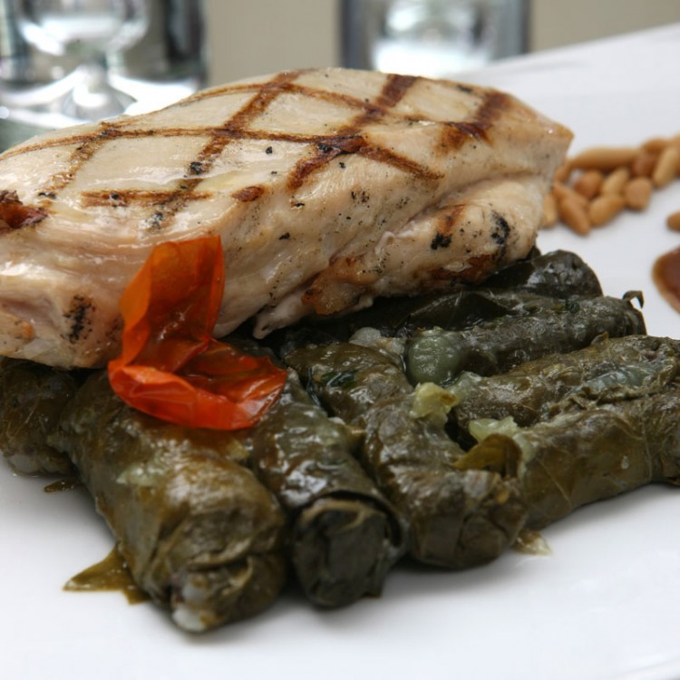 7. يقلب ورق العنب في طبق التقديم، وينزع الدجاج ليوضع إلى جانبه.ويقدّم مع اللبن.