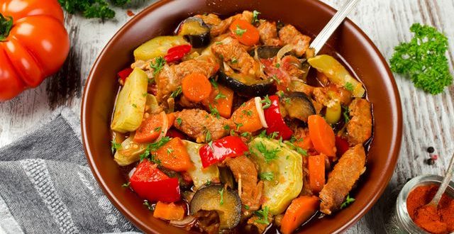 3 – أضيفي الباذنجان، الجزر، البطاطس، الجزر، الكوسا والفلفل الرومي. اغمري المزيج بمرق اللحم.