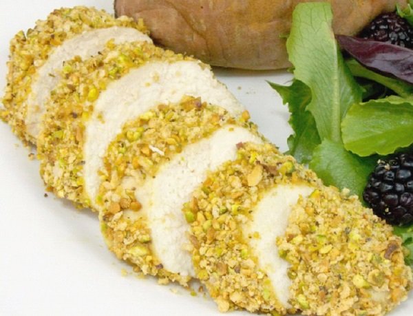 - ندهن الدجاج باللبن والمايونيز، ثم نضغطها بخليط الفستق .