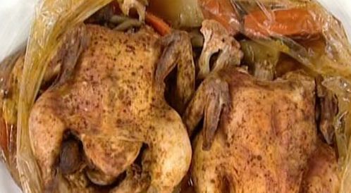 - وضع أنصاف صدور الدجاج في طبق الطبخ على الورق الخاص بالخبز. ثم توزيع الجزر والفلفل الأخضر والكرفس والبصل الأخضر والبقدونس حول أنصاف صدور الدجاج.