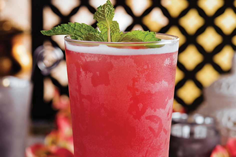 تضرب جميع المكونات في الخلاط أو تخلط جيدًا في إبريق ويقدم المشروب مع مكعبات الثلج