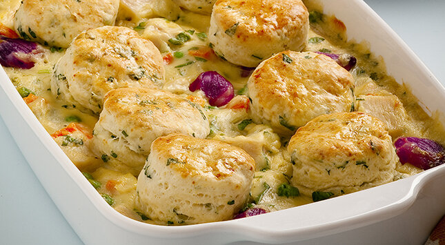 تُرفع اليخنة من الفرن ويُرص البسكويت على وجه الحشوة. يدهن البسكويت بدهان البيض ويُخبز مرة اخرى لمدة من 20 إلى 30 دقيقة حتى يُحمر البسكويت وتصدر الفقاعات على سطح اليخنة.