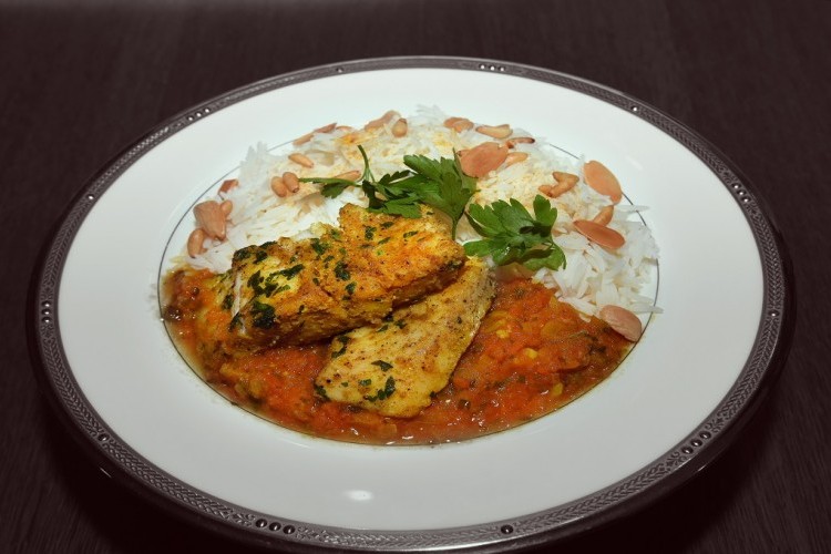 6.  يضاف إلى المزيج سمك الهامور الفيليه ويطبخ على نار متوسطة لمدة 5 دقائق.