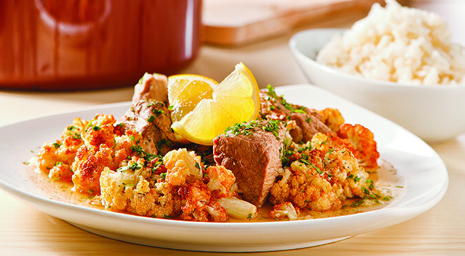 عندما يقترب اللحم من النضج تضاف قطع القرنبيط إلى القدر وتترك لتنضج.