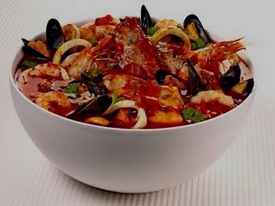 ٢. تضاف ثمار البحر، الفلفل البارد والحار والبهارات ويقلب الخليط ثم توضع الطماطم والملح ويقلب، يترك الخليط علی نار هادئة لمده عشر دقائق.