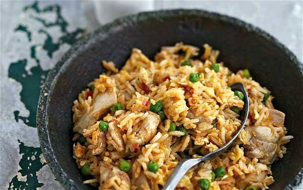 - يضاف الدجاج والأرز المسلوق ، الصويا صوص والتباسكو ثم يقدم الأرز الصيني.