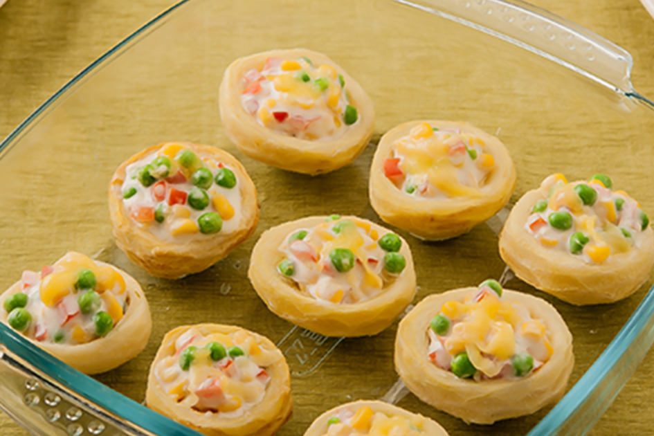 يُرش الوجه بـ¼ كوب من جبن الشيدر. يُخبز الخليط لمدة 10 دقائق تقريبًا إلى أن يصبح ساخنًا.