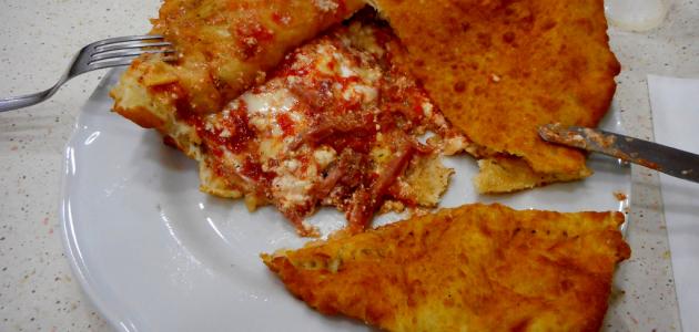 - وضع قرص أو قرصين من البيتزا في الزيت المسخن، وتركه حتى اكتساب قاعه اللون الذهبي ثمَّ قلبه بملعقة عريضة على الجهة الأخرى والإنتظار حتى اكتسابه اللون الذهبي، وتكرار هذه الخطوة مع باقي الأقراص.
