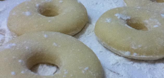 - نرش القليل من الطحين على سطح مستوٍ ونفرد العجينة بالشوبك ليصبح سمكها اثنين سنتميتر ثم نقطّعها على شكل دوائر، من الممكن استخدام قطّاعة خاصة أو كوب، ثم نستخدم قطّاعة دائرية صغيرة لقطع حبة الدونات من المنتصف بحيث تصبح الدائرة مُفرّغة بشكل حلقة.