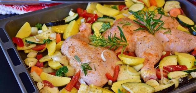 - توزيع قطع الدجاج على الخضار في طبق الفرن، ونثر ما تبقى من خليط البهارات على الدجاج والخضار.