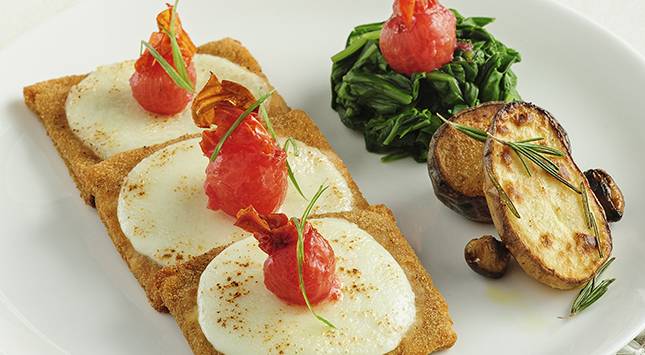 يُغمس إسكالوب لحم العجل في الدقيق، ثم في البيض، ثم في خليط البقسماط والجبن.