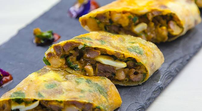 في وعاء، يخلط كل من اللحم والبقدونس المفروم ناعم وبيضتان مسلوقتان جيداً ومقطعتان إلى مكعبات والفاصولياء البيضاء والجبنة المبشورة والملح والفلفل الأسود مع الحرص على أن يكون الخليط جافاً.