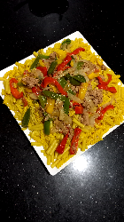 - قطعي الفلفل والبصل سلايسات وضعيها في قلاية مع زيت الزيتون حتى ينضج.