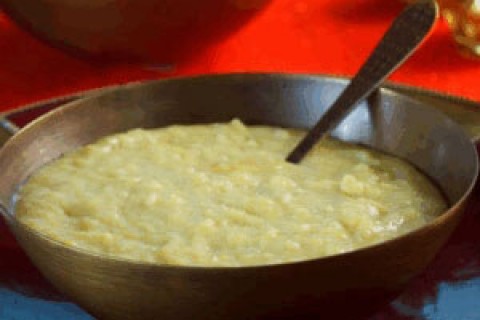 - في قدر متوسط الحجم، يُمزج السميد مع الحليب وتُترك المكونات لتغلي.