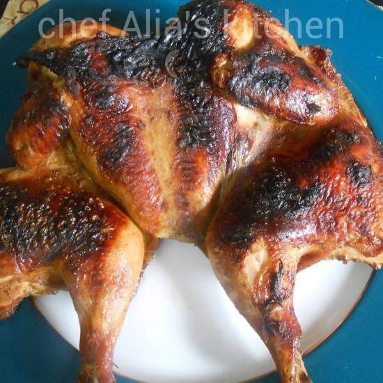 - تخلط المقادير السابقة وتتبل بها الدجاجة جيدا وتوضع التتبيلة فى الثنايا وتحت الجلد وتوضع فى وعاء وتغطى باللاستيك فيلم ( النايلون ) وتوضع بالتلاجة لمدةعلى الاقل 6 ساعات .