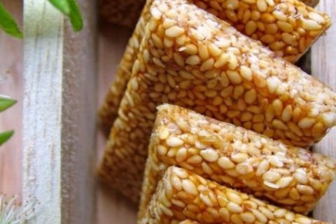 - فى صينية مسطحة مفروشة بورق الزبد نوزع خليط السمسم.